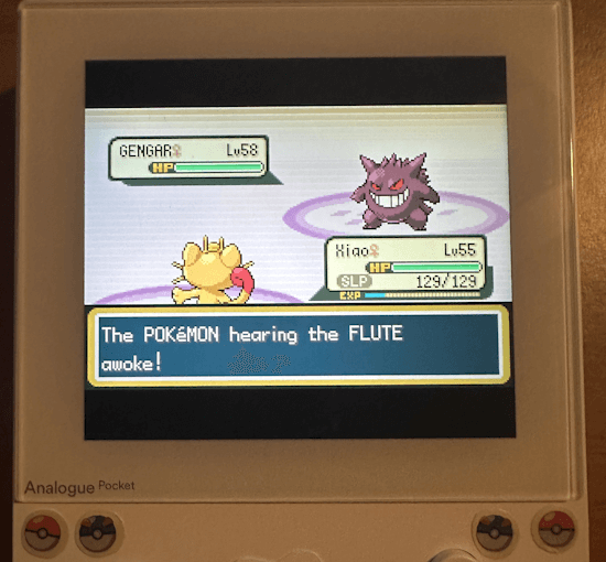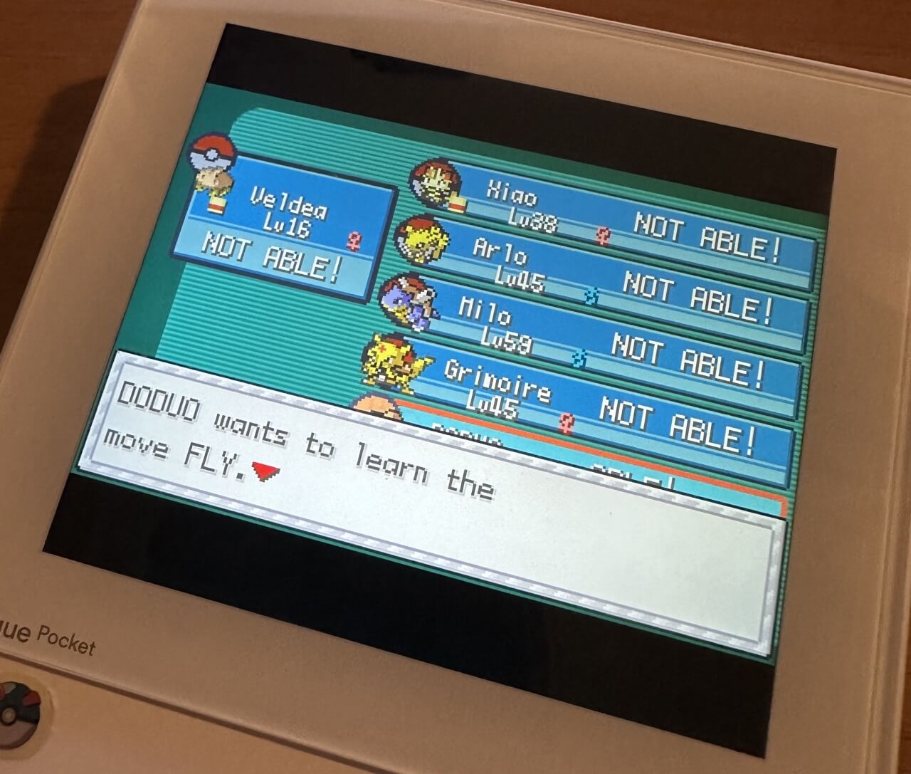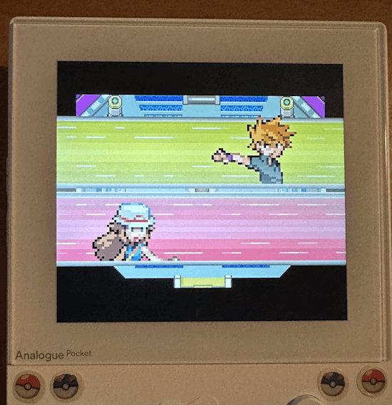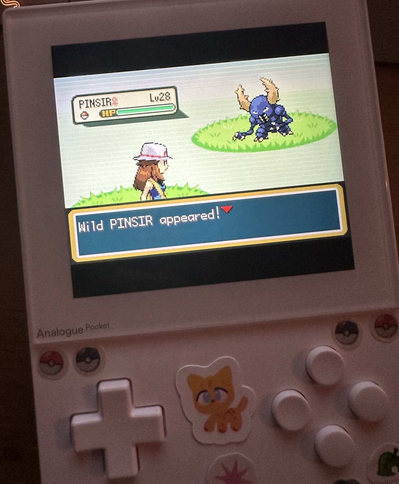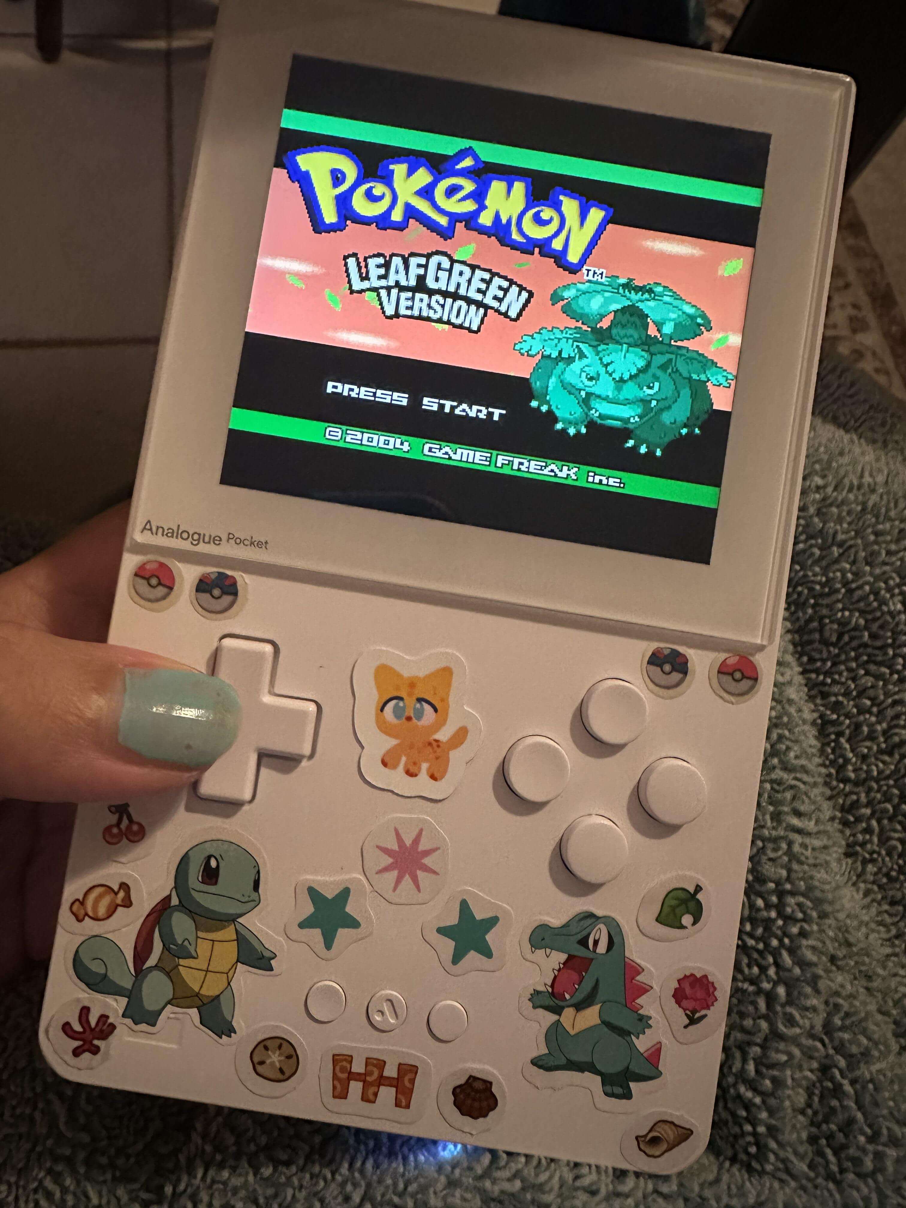 in terms of hardware, i used an emulator for most of this challenge (namely, for all of the shinies save for the final one). my main reason for this was so that i could take clear screenshots for this post, but i also wanted to make backups of my save file after finding each shiny, and ALSO to make the soft-resets easier on my hands versus with my ds lite. i single hunted for each shiny - meaning i used one window with my own copy of leafgreen (which i got as a present back when i was a kid!) - and i obviously used absolutely no save state or shiny-spawning cheats, as that would've totally defeated the purpose of the badge quest. for the final hunt of the challenge, i managed to get my hands on my very own analogue pocket, so i swapped to using that instead! the analogue pocket has a built-in screenshot feature, which i used quite a few times - but it also has a BEAUTIFUL screen, so i ended up taking photos of it, too.