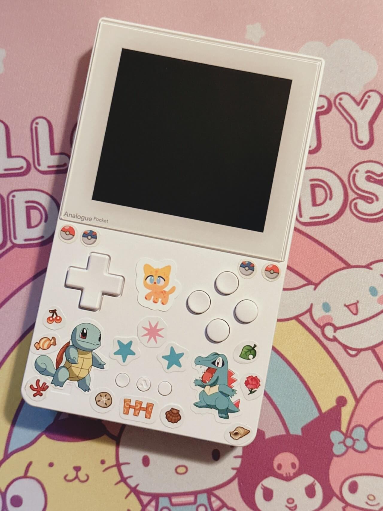 it was during this time that i also managed to buy an analogue pocket! like i mentioned at the start of this blog post, i swapped over to hunting on my Beloved Game Boy once it arrived. here's a picture of it in all its decorated glory!