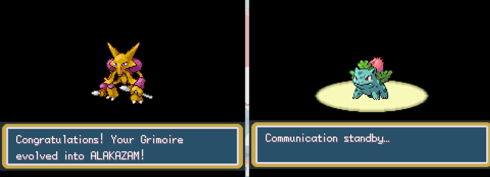 while i didn't do any other shiny hunts for the rest of my challenge, i DID have a few other tasks that i needed to tackle before taking on the elite four. my first order of business was FINALLY evolving grimoire the kadabra into an alakazam. at first, i thought that i had the hardware to do this with my analogue pocket - but, as it turns out, i didn't, as my adapter wasn't compatible with it UNLESS i sanded part of it down... and i didn't want to take that risk. trading with pokemon colosseum wasn't an option, either, as, even though i had the hardware to do so, i'd unlock trading to games OTHER than firered or leafgreen during leafgreen's post-game. since i wanted my alakazam to be included in my first leafgreen hall of fame, this posed a bit of a problem.