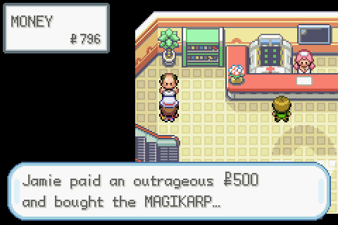 my second shiny hunt was for a shiny magikarp - specifically, one bought from the ICONIC magikarp salesman on route 4! when i was a kid, i always bought this magikarp, because i thought it was incredibly cool that you could get one before nabbing the old rod. i thought those 500 pokedollars were 500 pokedollars well spent, and, tbh? despite what the game implies with that text box, i firmly maintain that i was CORRECT.