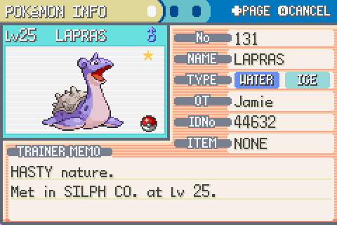 i managed to nab a shiny silph co lapras after a ridiculously short 514 resets! laertes saw how fast eevee came home and was like ‘idk man… i can get there faster, i think.’ i was beyond shocked to see him sparkle THAT quickly - in a 1/8192 game, no less! i genuinely think i will never get luckier than this in any 1/8192 game, haha!