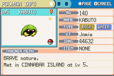 keeping up with the trend of iconic kantonian hunts, i decided to shiny hunt for a fossil pokemon for the volcanobadge's slot! i had a few options here, but i ultimately went with my fav fossil pokemon of all time - kabuto. the dome fossil that i picked up all the way back in mt moon prior to getting my 2nd badge was crucial here!