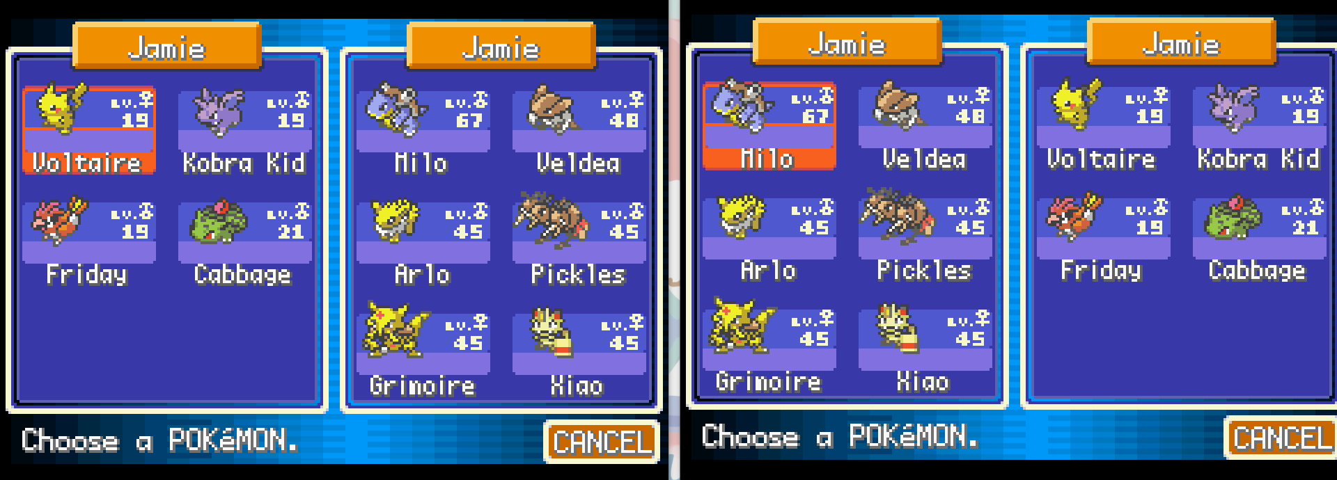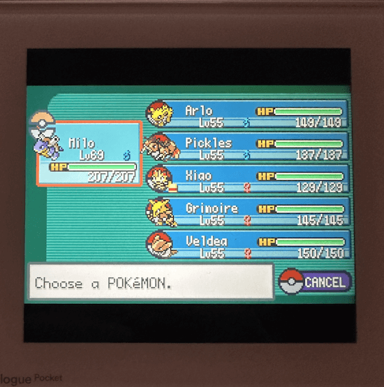 now that grimoire was a fully-evolved pokemon, i buckled down and got to training for the elite four. that, in itself, was a grind and a half! your rival's pokemon are in the early 60s, so i decided i'd try to get my whole team to level 55. milo, my blastoise, was pushing 70, so i figured that he'd be my anchor of sorts if i ended up in a thorny situation.