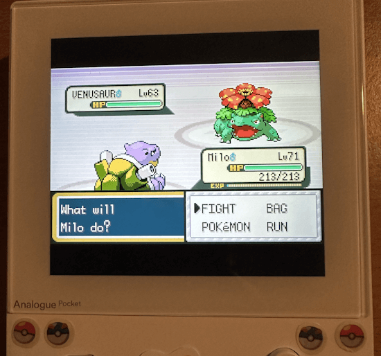 milo had a touching reunion with green's venusaur. even with the type disadvantage, i always feel like recreating the very first battle is super important; it's one of my little pokemon traditions.