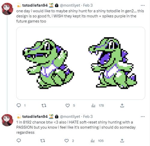 related to this, i recently started working on the totodile section of this site. part of that section is a page dedicated to totodile’s history. that essay isn’t quite done yet… but during my research, i noticed how much they changed the shiny totodile sprite from gen3 onwards. i won’t analyze this change too much here, since that risks repeating the stuff i’ve written about for that portion of the site, but it got me thinking about how cool it would be to have a gen2 shiny totodile in addition to the one i hatched in gen7 (his name is ‘matcha’) and the one i found during totodile community day in pokemon go (his name is ‘rawst’). that sentiment prompted these tweets: