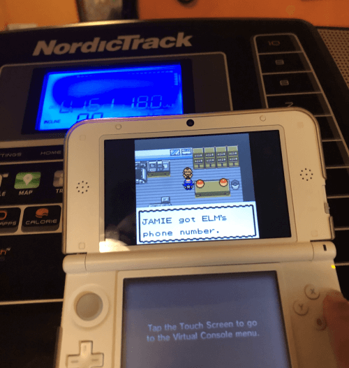 i hunted and hunted. sometimes i was totally in the zone - distracted but not too distracted; motivated to keep on going for my rare totodile. at other times, i felt like i was wasting my time, and that totodile would always evade me. today, morale was high, for the most part - though it ended up dipping at around 4pm. when i really felt like i was in a slog, i got ready to take my 3ds to the treadmill for a change of scenery.