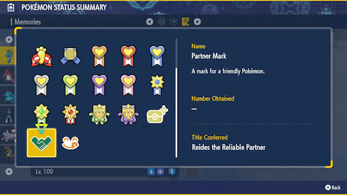 i then decided that i'd try to get the other two marks on reides in one fell swoop. the first of these marks was the itemfinder mark, which your pokemon has a chance of getting when they pick up an item in the overworld. to get this mark, you have to make use of the let's go feature, which allows your pokemon to walk alongside you. the second of these marks was the partner mark, which... can be quite the ordeal. your pokemon basically has a 1/100 chance to get this mark with every 10k steps that you take. additionally, your pokemon also has to be friendly towards you in order for them to have a chance at getting this mark.