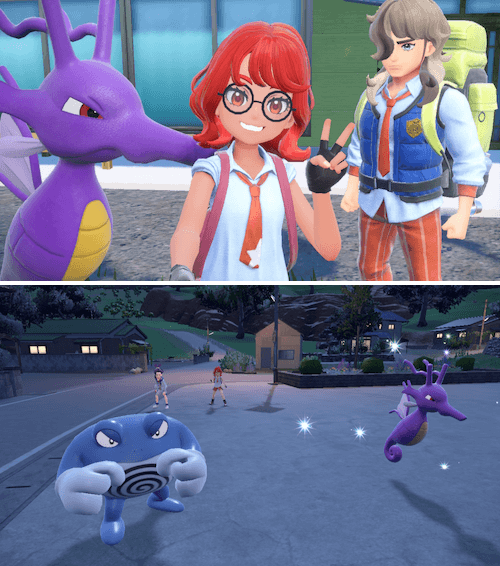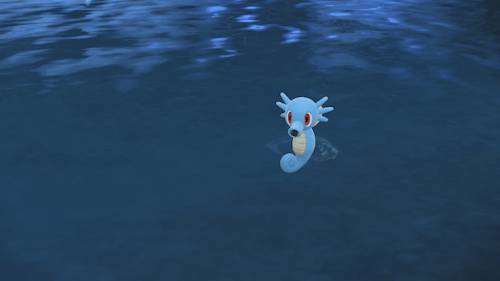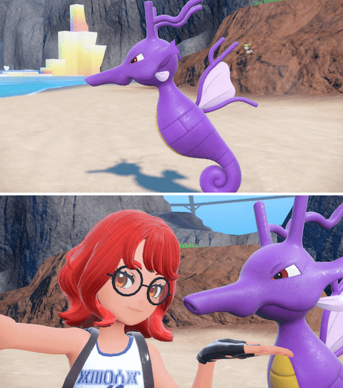 as a big pokemon fan, i tend to play new games and dlc the very moment that i can. in the current era of #gaming, that means obsessively checking for game updates on the night of dlc releases. as i mashed that + button on my pro controller to check for updates to my copy of scarlet, i felt especially nervous. thanks to people being mischievous and sneaking alleged leaks around on twitter, i knew that the horsea line was supposedly being introduced into the game... but i'm extremely skeptical by nature. (can you believe that some people go on the internet and lie?!?!) i didn't want to believe that reides' ribbon master journey would continue until i saw a little horsea (or seadra... or kingdra...) swimming around in a digital body of water myself. once my game finally updated, i sprinted over to blueberry academy as SOON as i could and began running around the terarium in search of a horsea. i found one swimming around in a lake almost immediately.