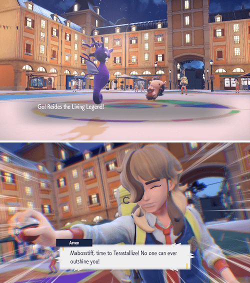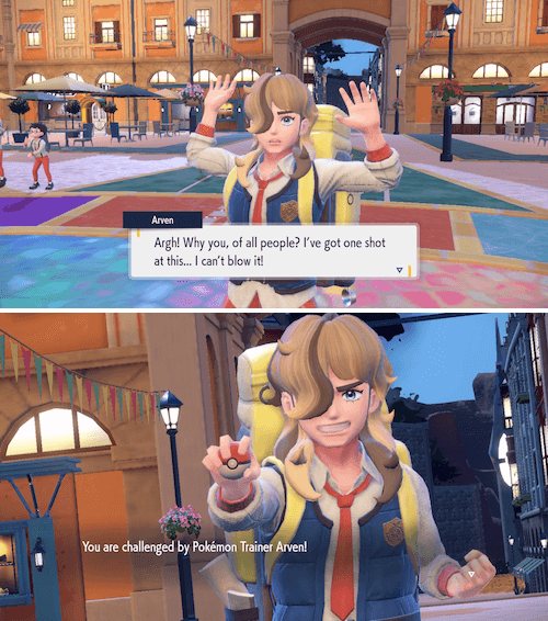 shoutout to him holding his pokeball upside down. just one more reason as to why he's truly one of the best pokemon characters. (btw, as happy was i was to see arven, i always feel so bad to fight his mabosstiff. that's my FRIEND!!!!!!)