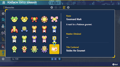 now that i was safe from indigo disk spoilers and emboldened with love for pokemon as a whole, i decided to pick up my ribbon-collecting in earnest once more... though the next ribbon on my list was not actually a ribbon. it was a mark! introduced in gen8, marks are basically the same as ribbons. i think of them as little stickers on pokemon, haha. the first one that i set my sights on was the gourmand mark, which has a chance of being randomly given to your pokemon after eating a meal with them! these meals can be the store-bought ones or the ones that you make yourself via the picnic system.