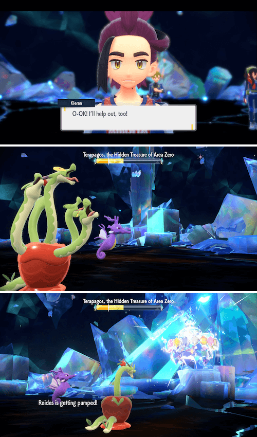 anyway, silly little wanderings aside, it was really cool to have reides involved in the big showdown against terapagos. i was especially happy when kieran snapped out of his funk and i got to battle alongside him. his hydrapple even used dragon cheer, powering reides up during the battle. it made the whole experience feel all the more significant.