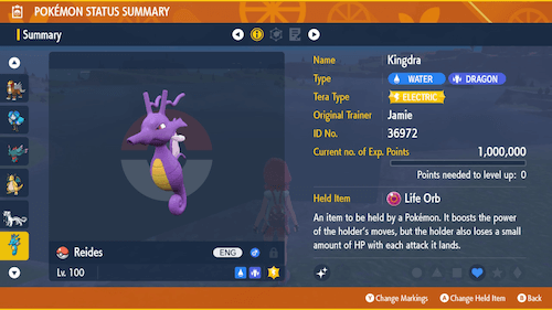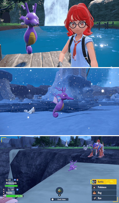 anyway, after a lengthy maintenance, pokemon home was eventually ready to go. i leapt right in, retrieving reides and plopping him into my party. i'm a huge fan of the updated pokemon models in scarlet, so i was hype to see the one that they gave shiny kingdra. i was NOT disappointed in the slightest!