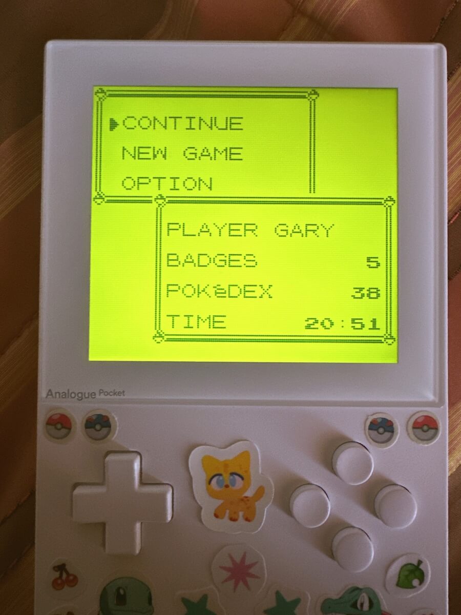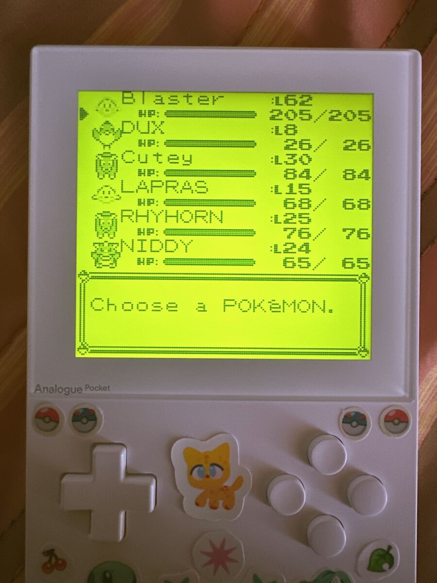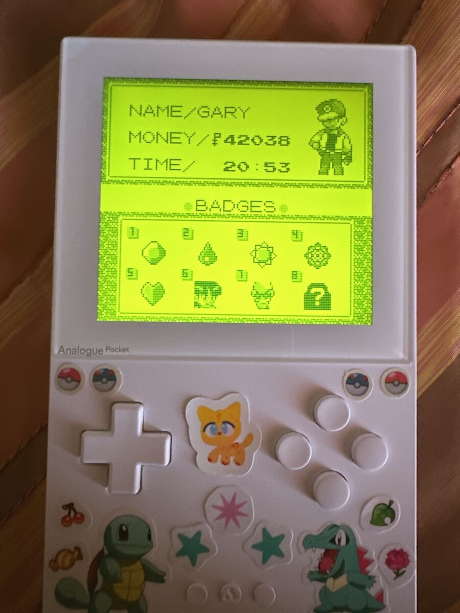 the backup process was successful and my childhood save was forever immortalized... but then i realized that, with the analogue pocket's screen, i could take some more... presentable pictures of my save. and that's exactly what i did - and what i want to share with you all in this blog post! i know it's probably shorter compared to some of my more recent posts (which chronicle pokemon challenges that i took on over the course of MONTHS... rest assured that i am taking on even more challenges and am hype to write about them in the future, haha!), but i thought it'd be cute to share regardless.