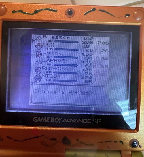 as you can see, my sp's screen has seen better days. i still cherish the photo for what it is: a list of my oldest 'surviving' pokemon team, taken while i was practically shaking with excitement. after peeking around the file a bit and taking some more photos, i stowed my cart away carefully and hoped that the save wouldn't corrupt over itself any time soon.
