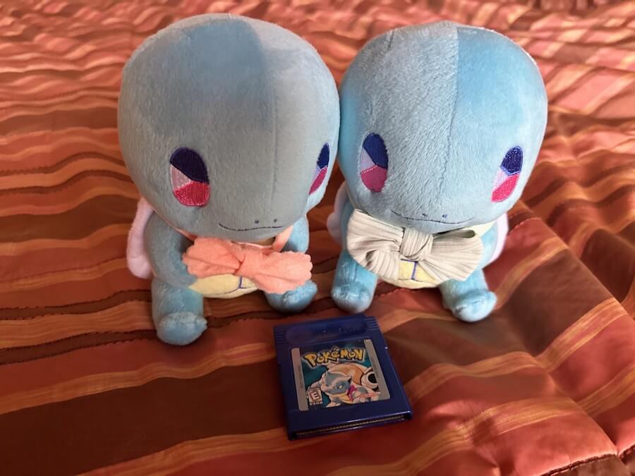 first of all, here's the title screen in all of its glory (ft. my two squirtle plushes - milo and marlo). upon loading up the game, i noticed something pretty iconic about my save file's name.