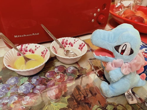 at any rate, avoiding all of the leaked information for this long makes me even more excited to play the game tomorrow after work. in fact, it has me so excited that i just had to do SOMETHING to celebrate the release of a game that i will surely pour hours and hours of free time into; a game that i'll enjoy and make awesome memories over with pals. i figured out exactly what i wanted to do and put that plan into action today, together with my mom and odile the totodile plush.