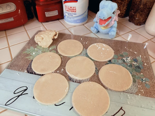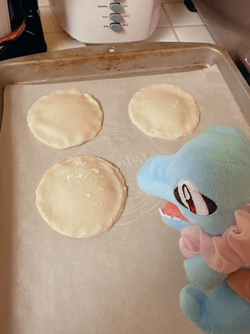 three wip galettes. we placed a glob of the marzipan mixture in between the two sheets of circular dough pieces in order to get them like this. it reminded me of ravioli, haha!