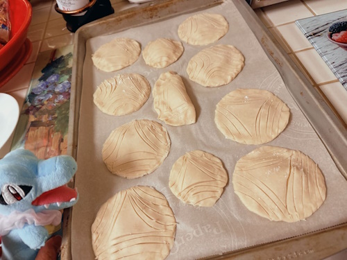 my mom felt bad for the poffin not getting a design, so she put one on it, too. i'm responsible for the rest of the designs... i never drew a pattern on dough before; i was worried that i'd ruin them! it was both easier and harder than i thought it'd be, somehow...