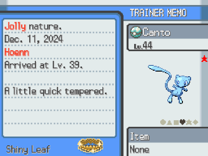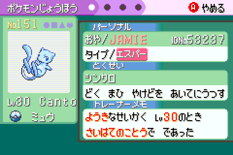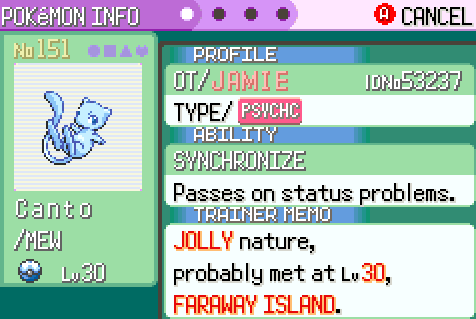 mew is an absolute classic. when i realised i could use a japanese copy of emerald version with the old sea map in order to NOT ONLY experience an INCREDIBLE event for the first time, but ALSO get a shiny one via rng manipulation... i simply knew what had to be done. but just getting this mew would never be enough; not when it was in a prime position for a ribbon master journey.