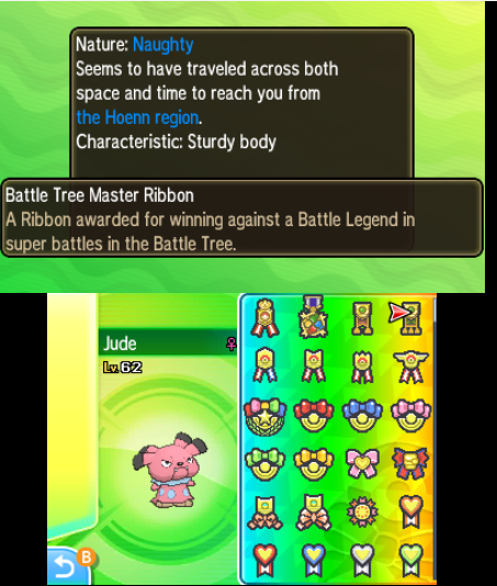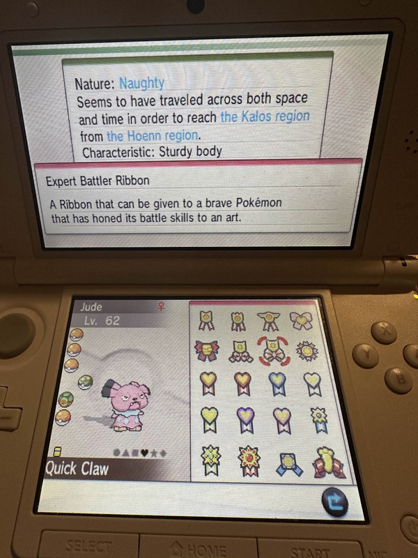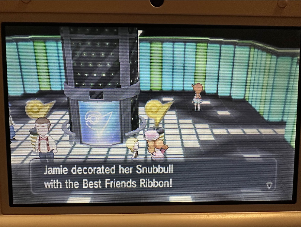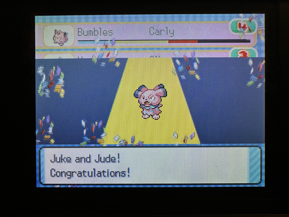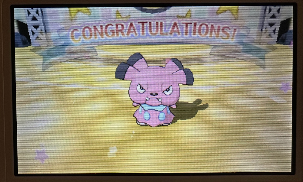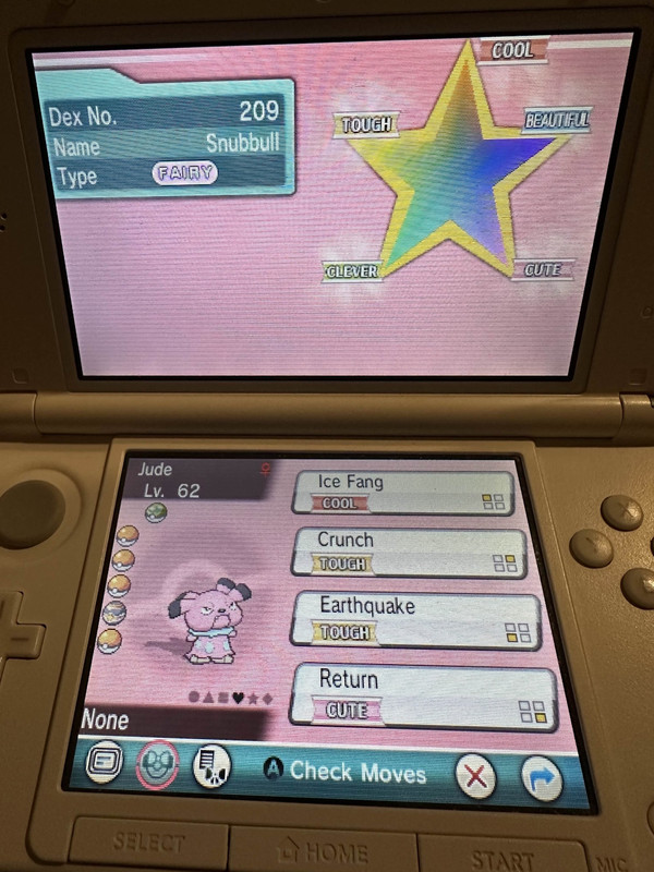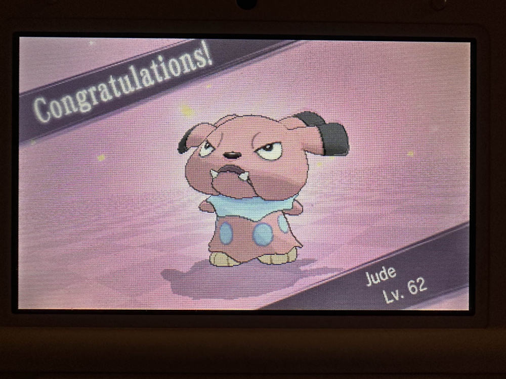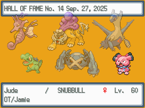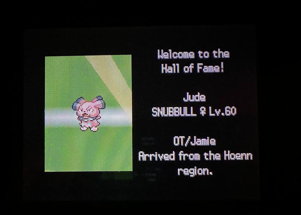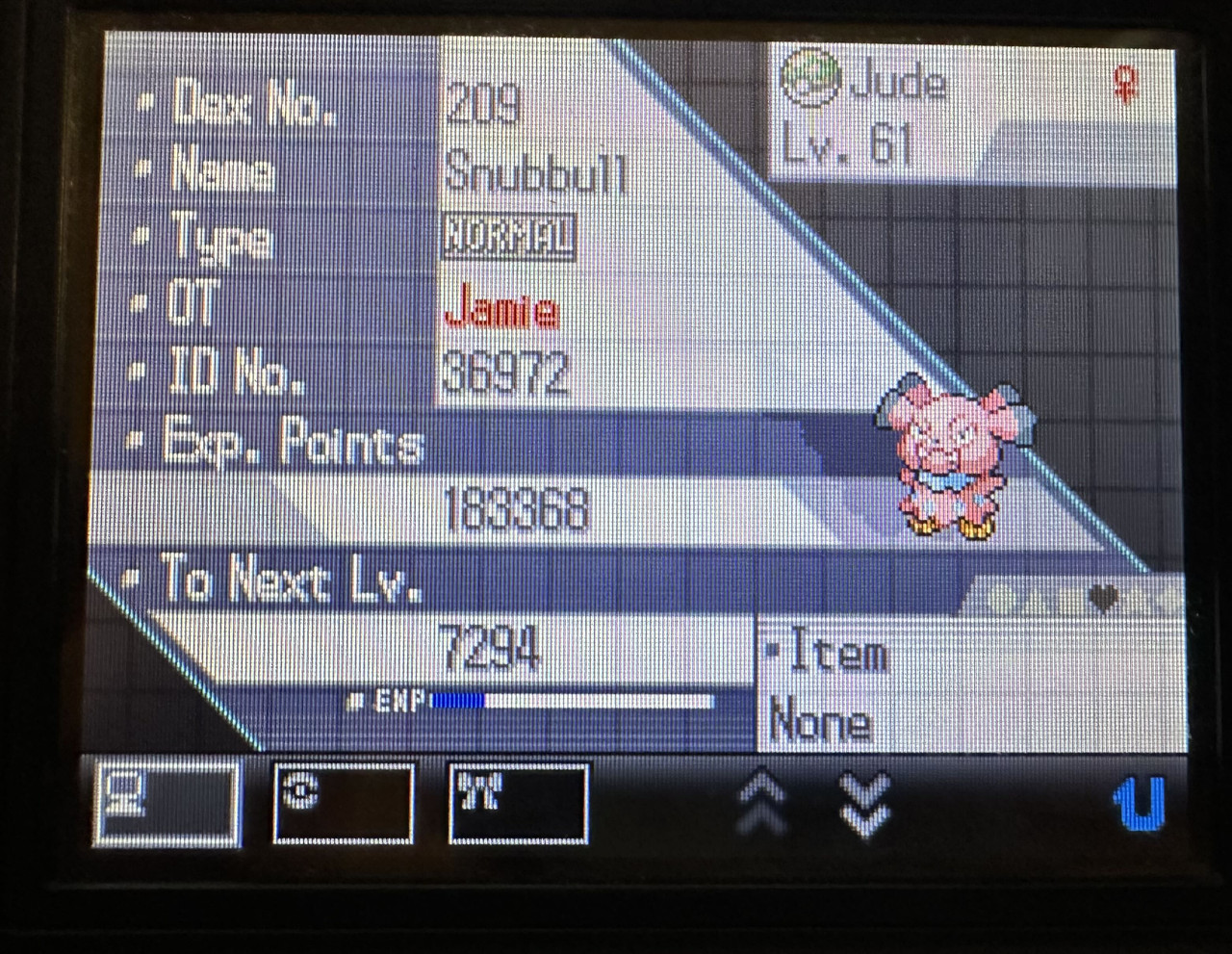 i named my plush snubbull 'jude' after st. jude, the patron saint of lost causes, whom i was praying to during everything. but i wanted to do more for snubbull somehow. i figured i could catch her in one of my pokemon games and have her exist in a digital forme as well. during that time, i was also working on completing the emerald pokedex so that i could rng hunt for a shiny totodile. i remembered that emerald version had snubbulls available in the safari zone during the post-game, and that it'd mean i could get all of the ribbons on one if i wanted. what better way was there to show the bond between jude the snubbull and me?