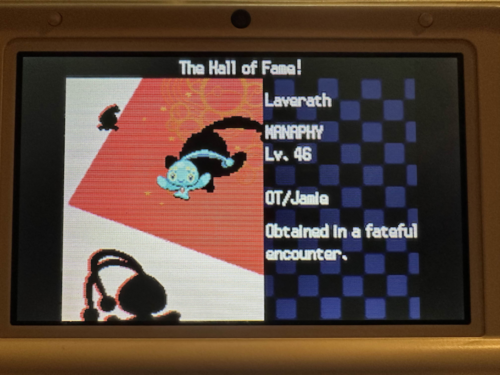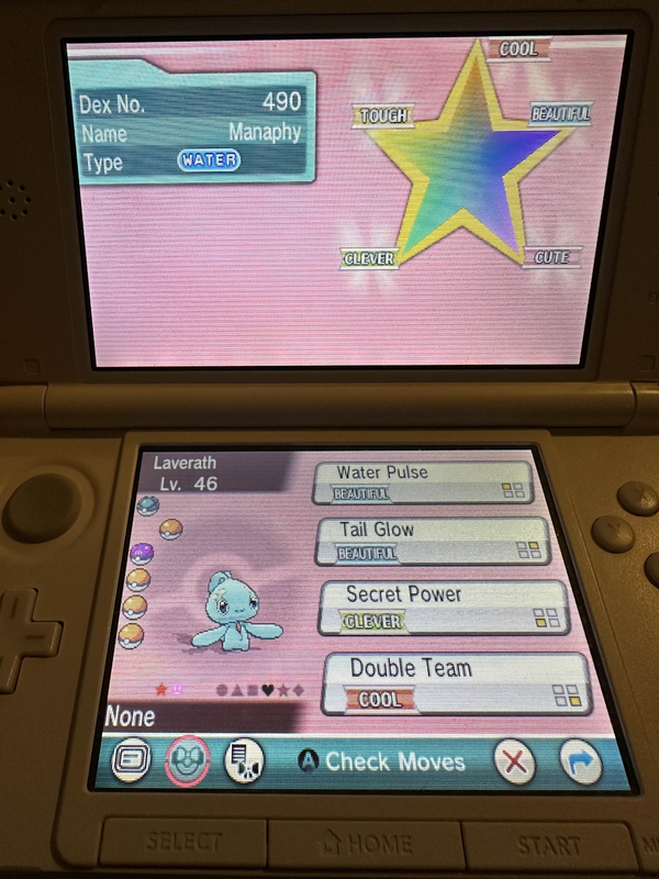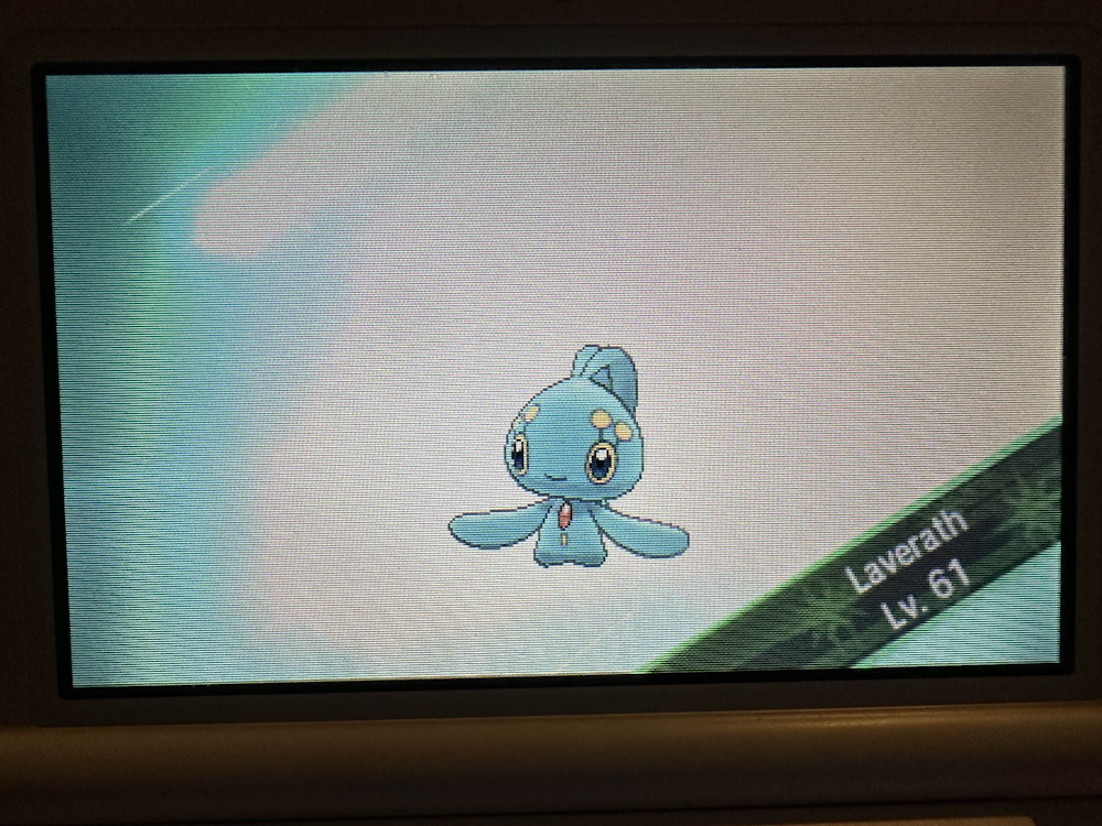 i did around 700 encounters by trading manaphy eggs over from a copy of pokemon ranger. since i was making really slow progress, i decided that i'd try out rng manipulation. it was a lot harder than i thought it'd be, to be honest! it took some research and i got it wrong a good few times lol - but, ultimately, i managed to hit the exact seed and frame for my ideal shiny manaphy... and i hatched laverath! it was glorious. nowadays, there is a comparatively easier way to shiny hunt for manaphy rather than going for the time consuming trade workaround (namely, via arbitrary code execution) - but back when i hatched laverath, that method wasn't known (or popularized, i should say). you can also now get a shiny manaphy as a pokemon home reward for completing the bdsp pokedex. i'm actually really glad that these methods didn't exist back when i got my gen4 shiny manaphy though, because i cherish the rng manipulation skills that laverath taught me! they'd go on to aid me with rng hunting for other pokemon, including FOUR other ribbon masters: reides, stormspike, canto, and gelato. pretty fitting that the prince of the sea ended up having so much influence, huh?