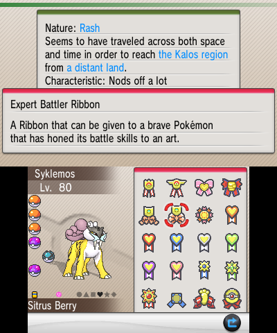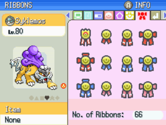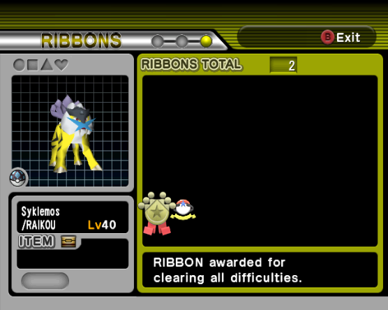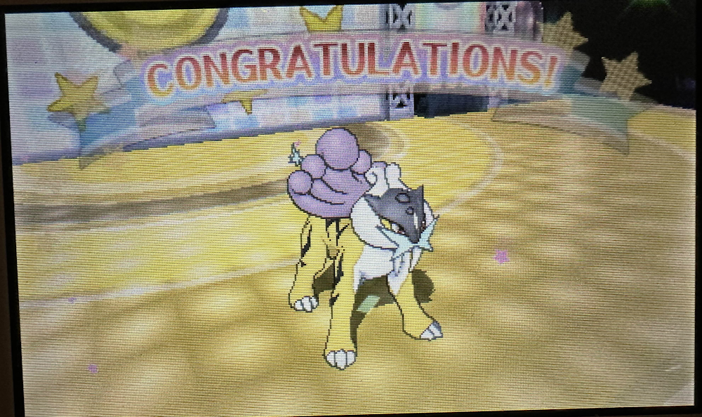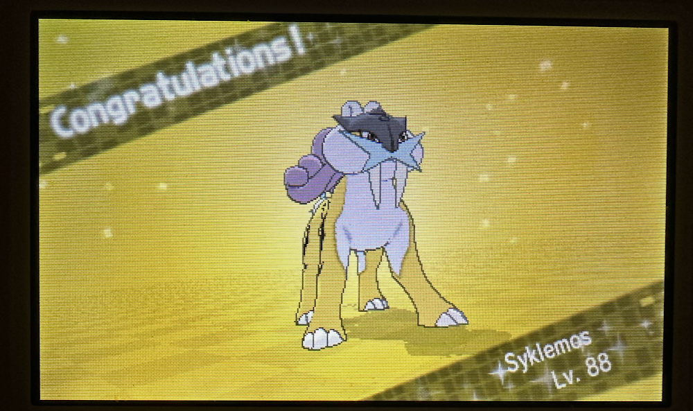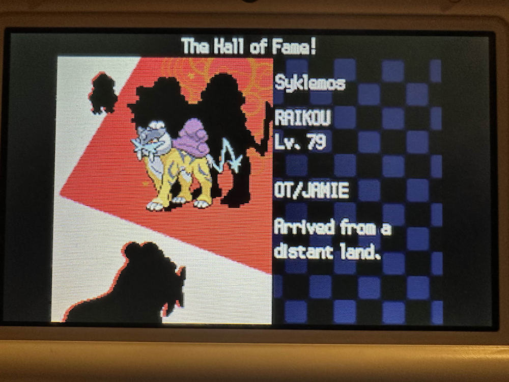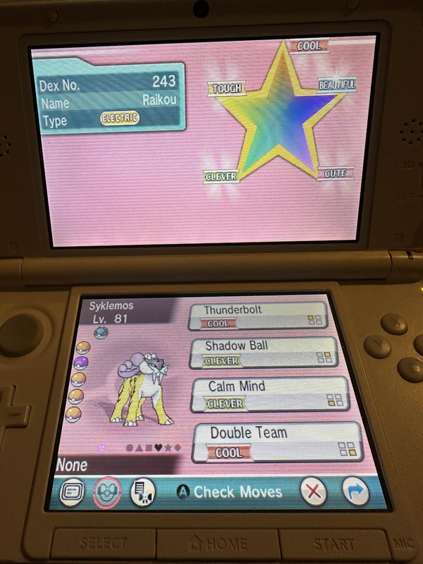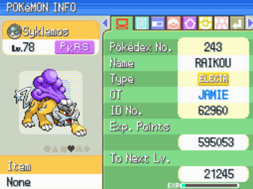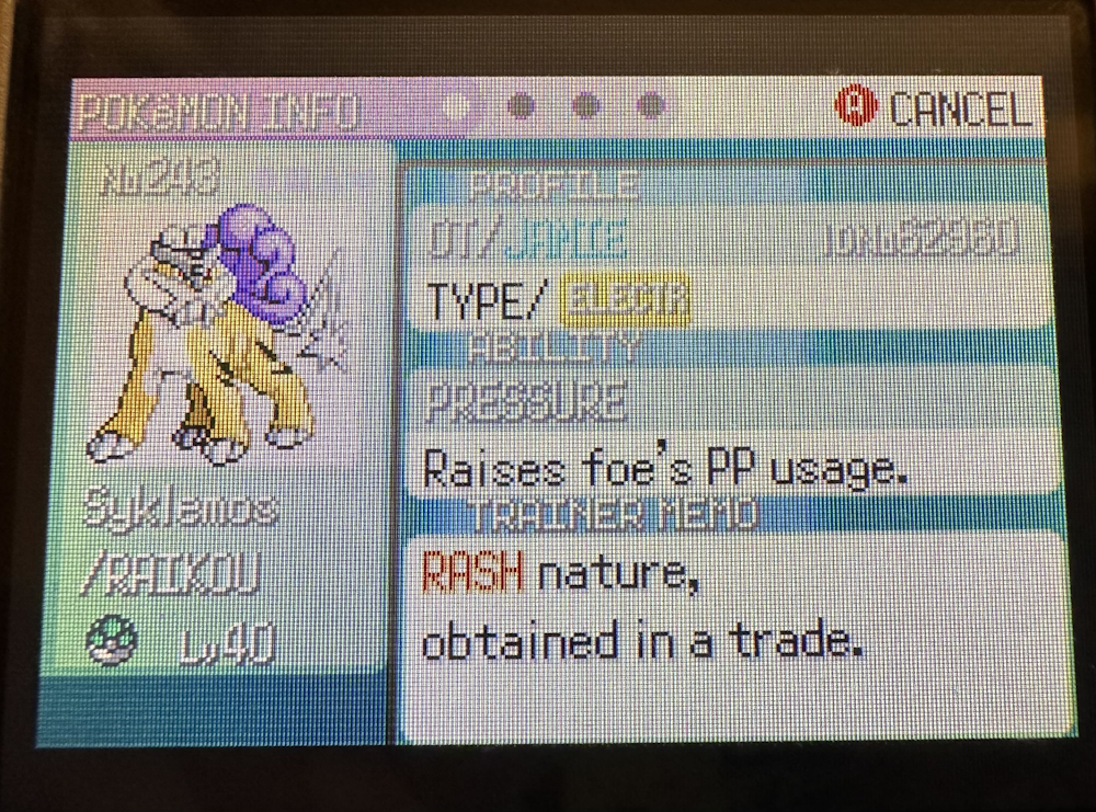 while i couldn't (legitimately) transfer up the raikou that i caught in silver version, i played through pokemon colosseum during reides' ribbon master journey. it was during that game's plot that i caught a raikou, whom i named syklemos. upon deciding that i'd go for another round of ribbon masters when the eventual shutdown of pokemon bank was announced, i knew that syklemos would make for a perfect candidate. accompanied by stormspike, my shiny colosseum croconaw, and, later on, laverath the shiny ranger egg manaphy, syklemos was a super welcome addition to my ranks of my ribbon masters.