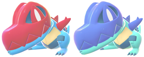 my friend paige also did this wonderful edit of totodile’s gen2 shiny form in the pokemon: home style. it really drives home the big change they made to it, huh?