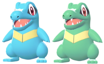 so, gen3’s shiny totodile sprite is a slightly different shade of green. it has more of a blue tint to it when compared to gen2’s. we can probably attribute this to a wider range of colours being available for the pokemon sprites. however, changes were also made to shiny totodile’s tongue, eyes, and spikes. i made a quick edit to show how a shiny totodile may have looked if we didn’t get these changes.